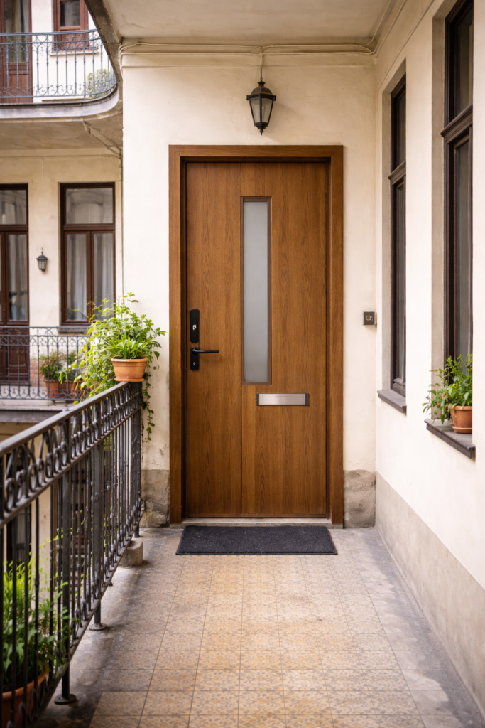 A modern fa bejárati ajtó ötvözi a természetes alapanyag melegségét a minimalista, modern kialakítási megoldásokkal.